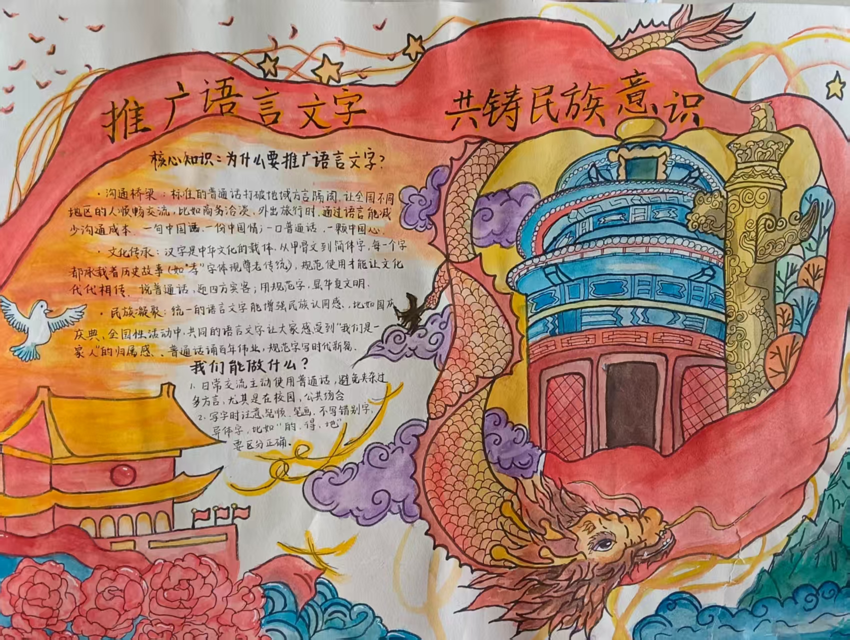 本届推普周活动形式多样、内容务实,涵盖倡议宣传、知识学习、氛围营造等多个维度。通过系列活动,全体师生使用国家通用语言文字意识显著提升,对“推广普通话与铸牢中华民族共同体意识”的关联有了更深刻的认识—规范的语言文字是促进各民族交往交流交融的“桥梁”,是凝聚民族共识、传承中华文化的重要载体。