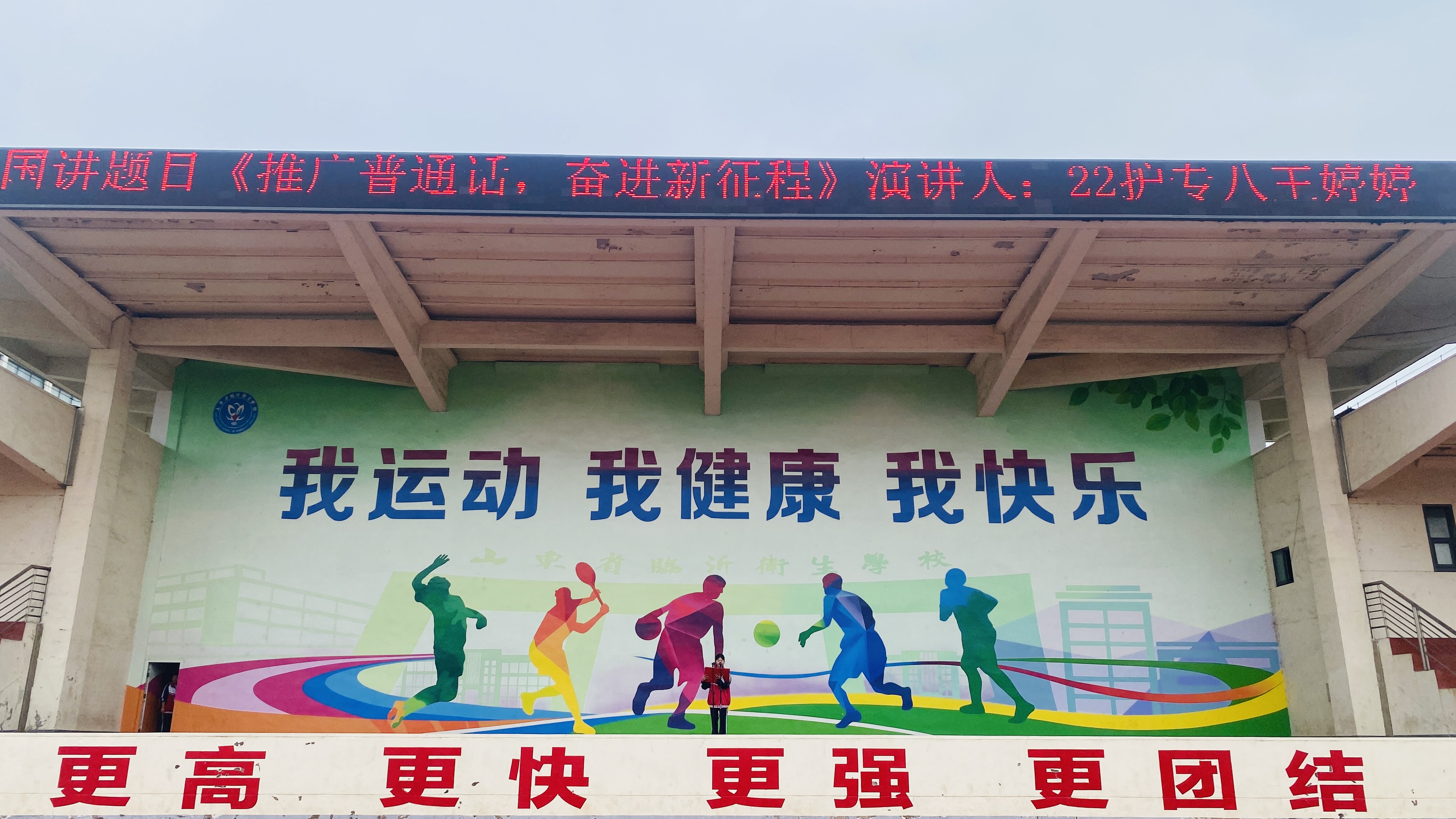 为提升活动知晓度与参与度,通过临沂卫校共青团公众号推送“推普周”活动;在校园多处LED电子屏滚动播放推普周主题标语;在学校醒目位置设置永久性推普宣传标识;在周一升旗仪式中,举行以《推广普通话,奋进新征程》为题的国旗下讲话;以班级为单位,组织学生制作“推广普通话”主题板报等多种活动。图文结合的形式展现普通话与民族文化传承、社会沟通效率的关联,进一步强化学生对推普工作的认知。