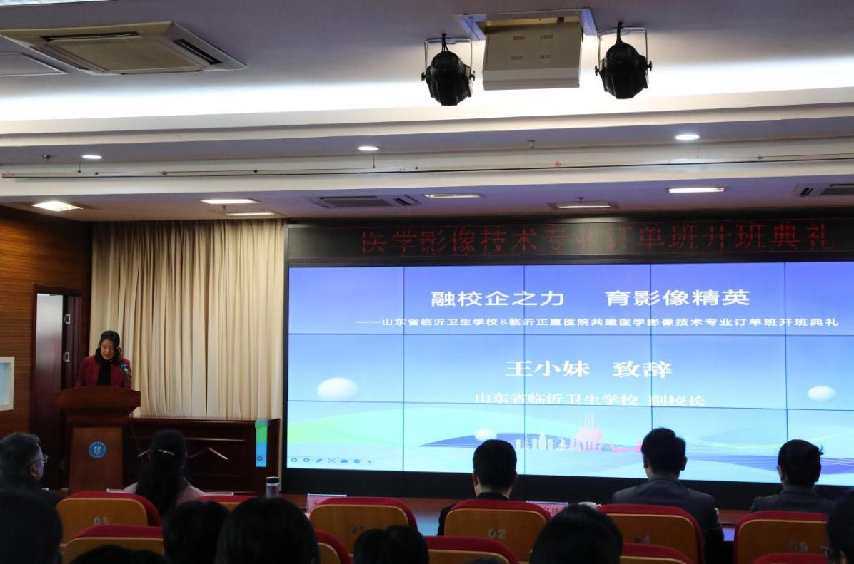2025年11月5日上午,我校2025级医学影像技术专业校企合作订单班开班典礼在五楼报告厅隆重举行。临沂市正直医院朱宝林副院长、医教部卞博文主任、医院办公室虞静主任、影像科于佳祥导师,以及我校党委委员、副校长王小妹共同出席活动。学校医学影像技术专业全体教师及2025级订单班全体学生一同参加。