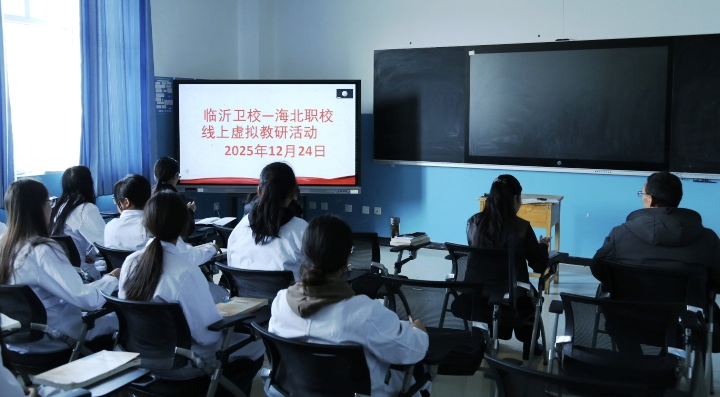 2025年12月24日下午,山东省临沂卫生学校与青海省海北州职业技术学校成功举办“同课异构·云端共研”鲁青“互联网+”同步教研活动。两校通过腾讯会议实时连线,围绕“脑血栓形成”章节开展说课研讨,共同探索职业教育教研新模式。临沂卫校党委委员、副校长王小妹,教务科及相关专业部负责人,与海北职校副校长崔立功(援青)等相关领导、教师共同参与了本次云端交流。