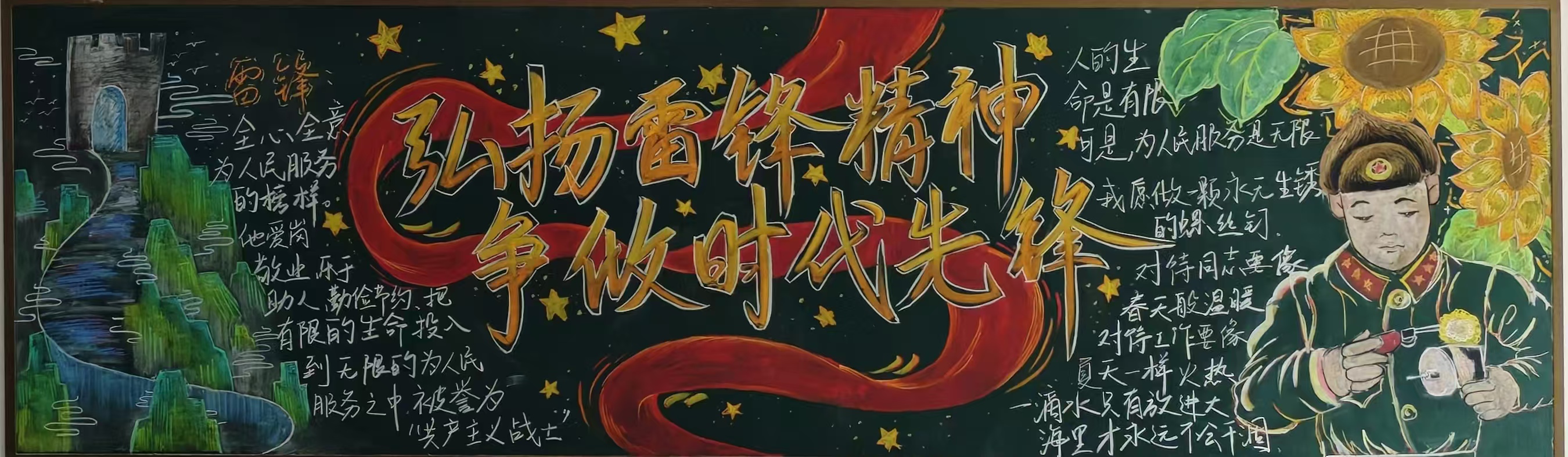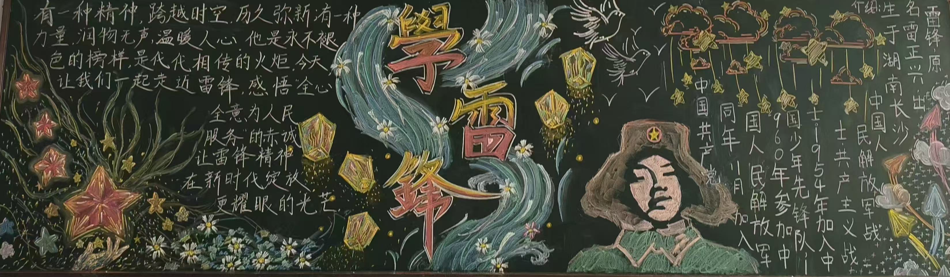 教学楼内,“弘扬雷锋精神,争做时代先锋”黑板报展评活动有序开展。各班级高度重视、积极参与,紧扣雷锋事迹与志愿服务核心要求,以粉笔为媒,勾勒雷锋肖像、摘录精神箴言、记录暖心善举,让雷锋精神在方寸板面落地生根、熠熠生辉,切实营造了浓厚的学雷锋氛围。