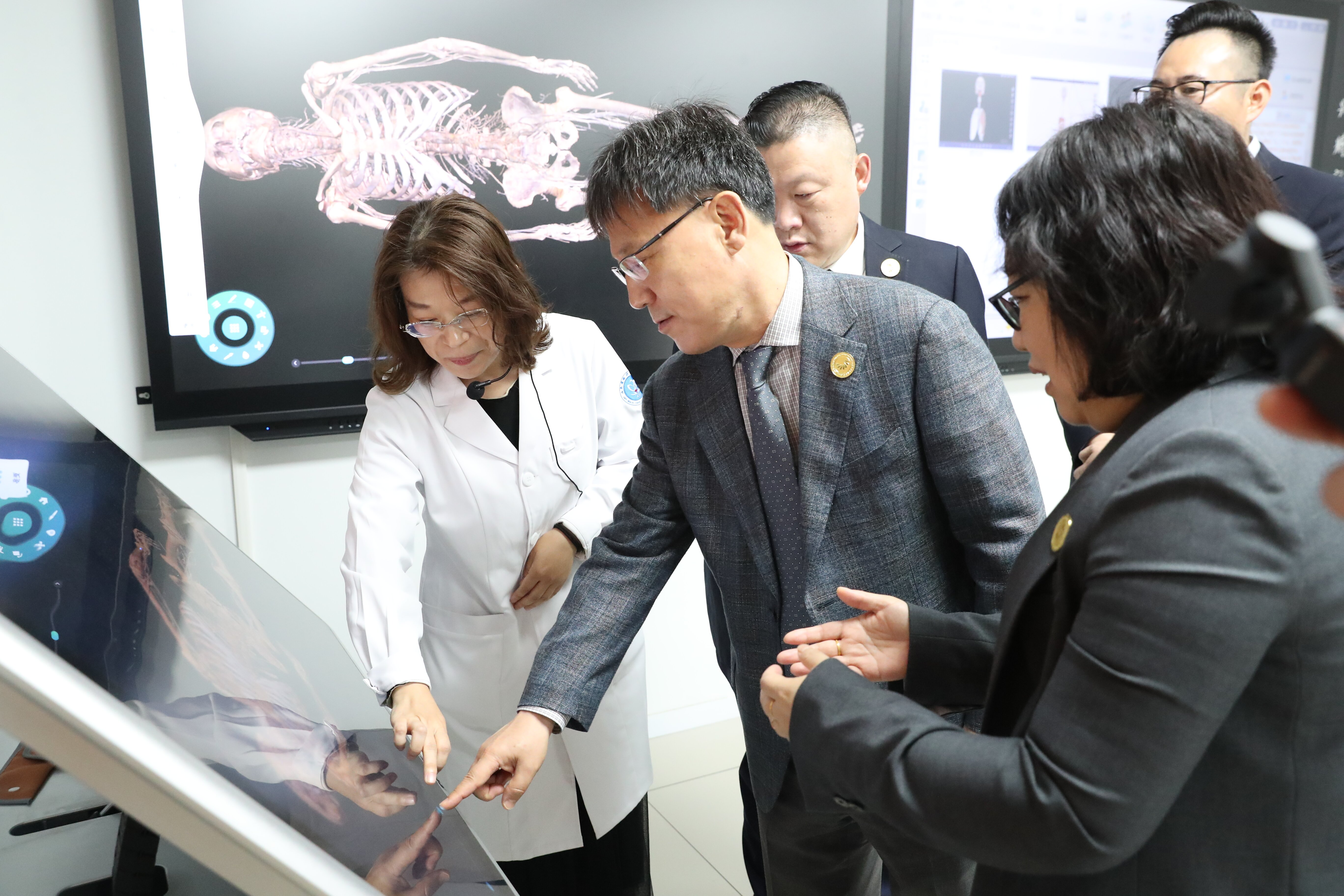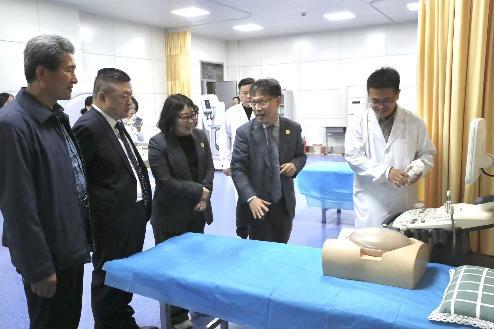 上午 9 时,韩国瑞永大学代表团先后参观了学校护理、解剖、影像等专业实训室。陪同人员详细介绍了各实训室建设理念、设备配置、实践教学开展情况及人才培养特色。韩方对学校优良的实训条件、规范的教学管理和扎实的专业建设给予高度评价,双方就实训教学、技能人才培养等内容深入交流。